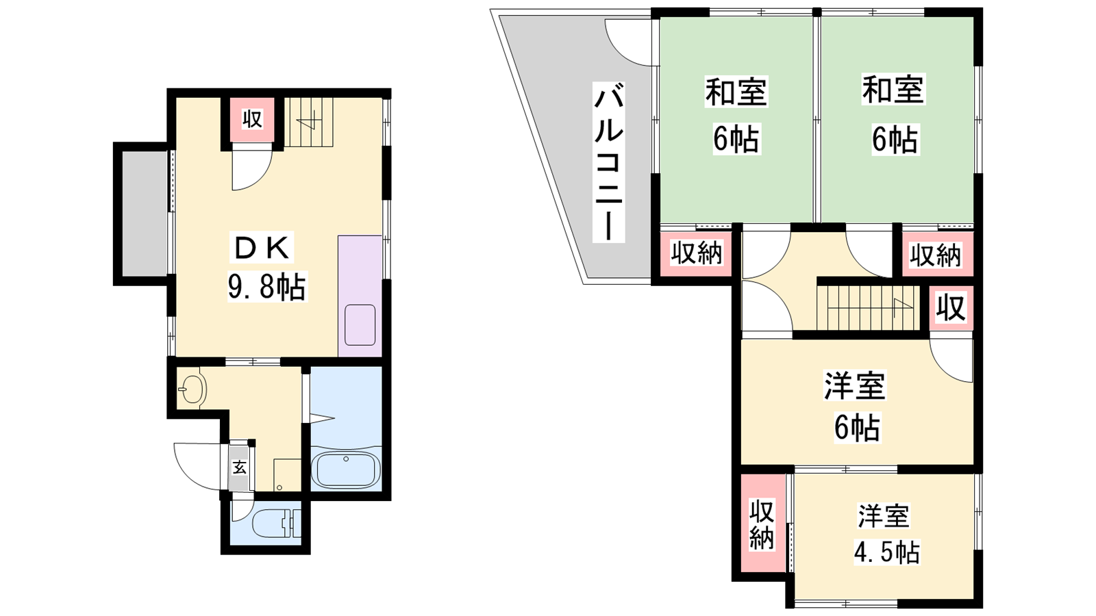 - DK9.8帖、洋室6帖、和室6帖、和室6帖、洋室4.5帖