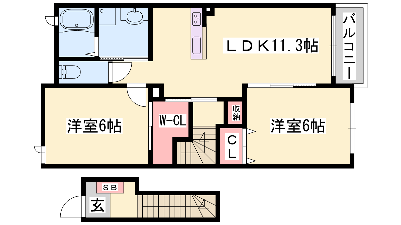 - LDK11.3帖、洋室6帖、洋室6帖
