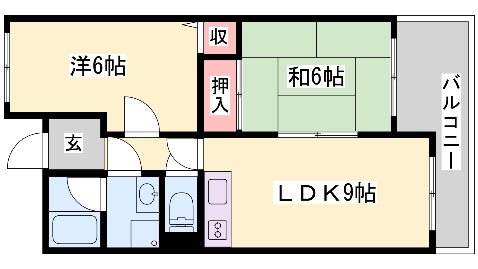 - LDK9帖、洋室6帖、和室6帖