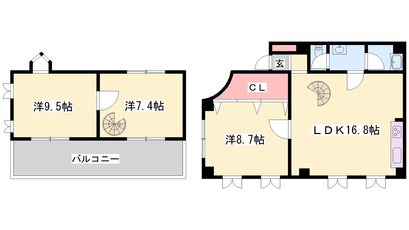 - LDK16.8帖、洋室9.5帖、洋室8.7帖、洋室7.4帖