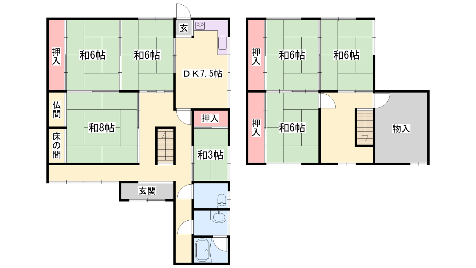 - DK7.5帖、和室8帖、和室6帖、和室6帖、和室6帖、和室6帖、和室6帖、和室3帖