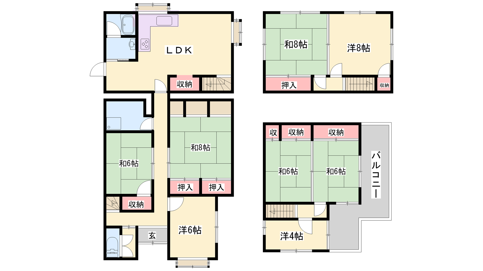 - 洋室8帖、洋室8帖、和室8帖、洋室6帖、和室6帖、和室6帖、和室6帖、洋室4帖