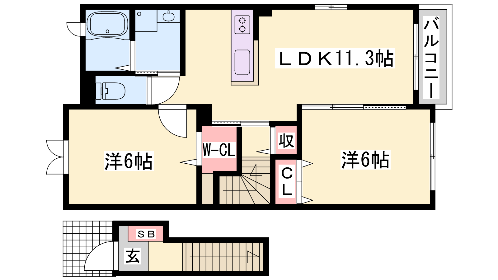 - LDK11.3帖、洋室6帖、洋室6帖