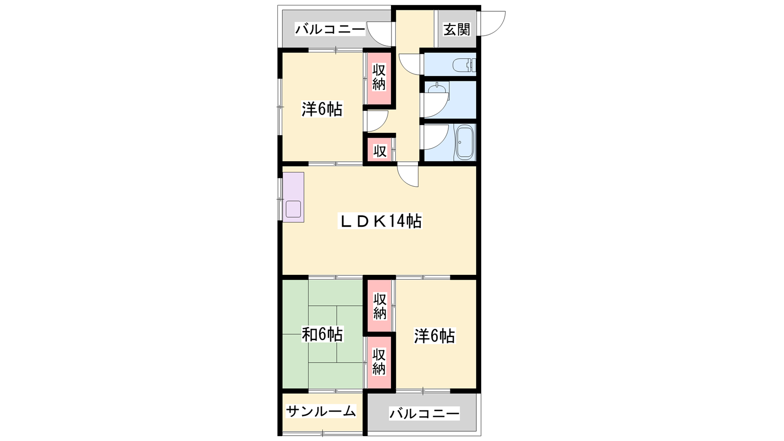 - LDK14帖、洋室6帖、洋室6帖、和室6帖