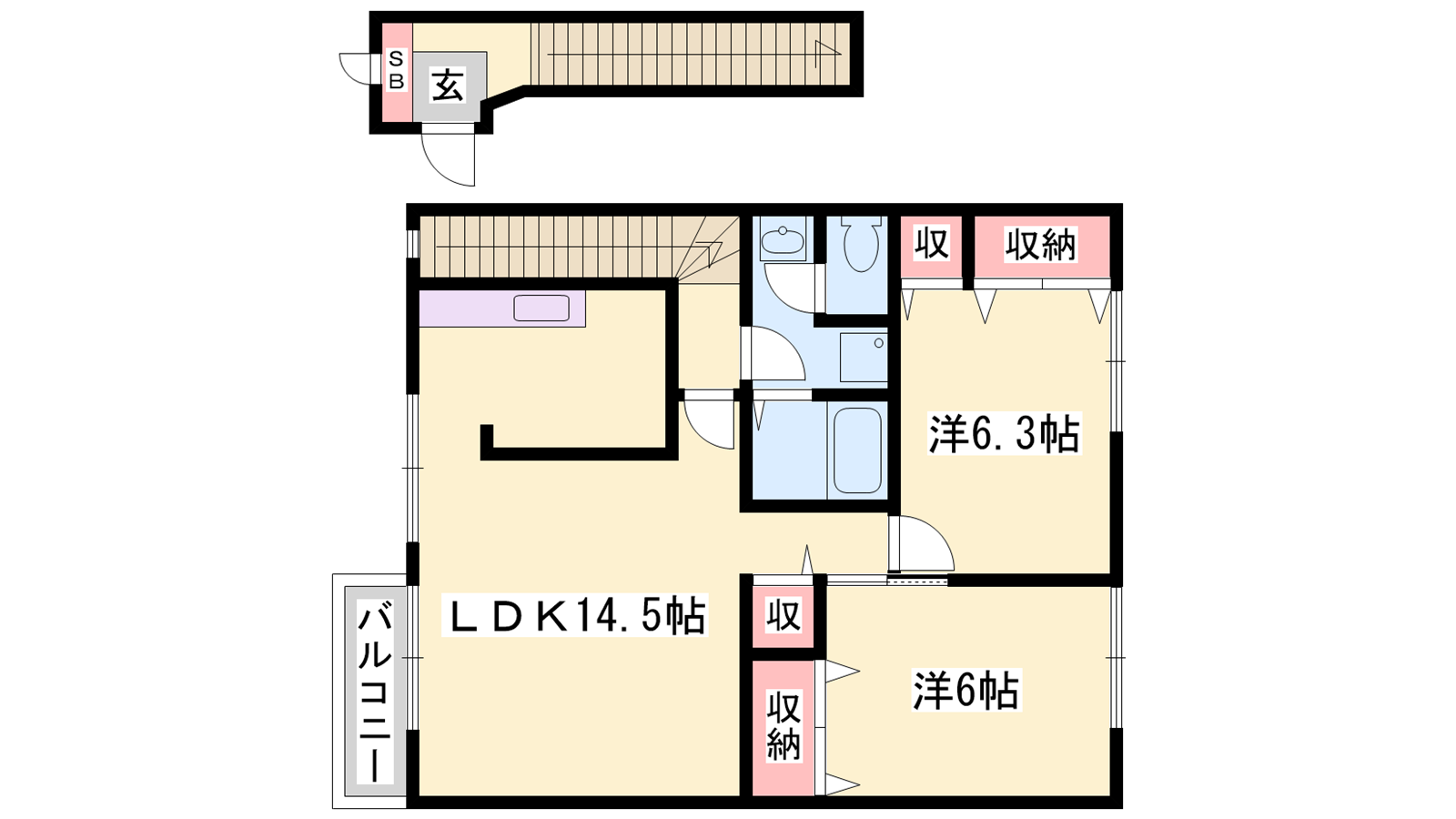 - LDK14.5帖、洋室6.3帖、洋室6帖