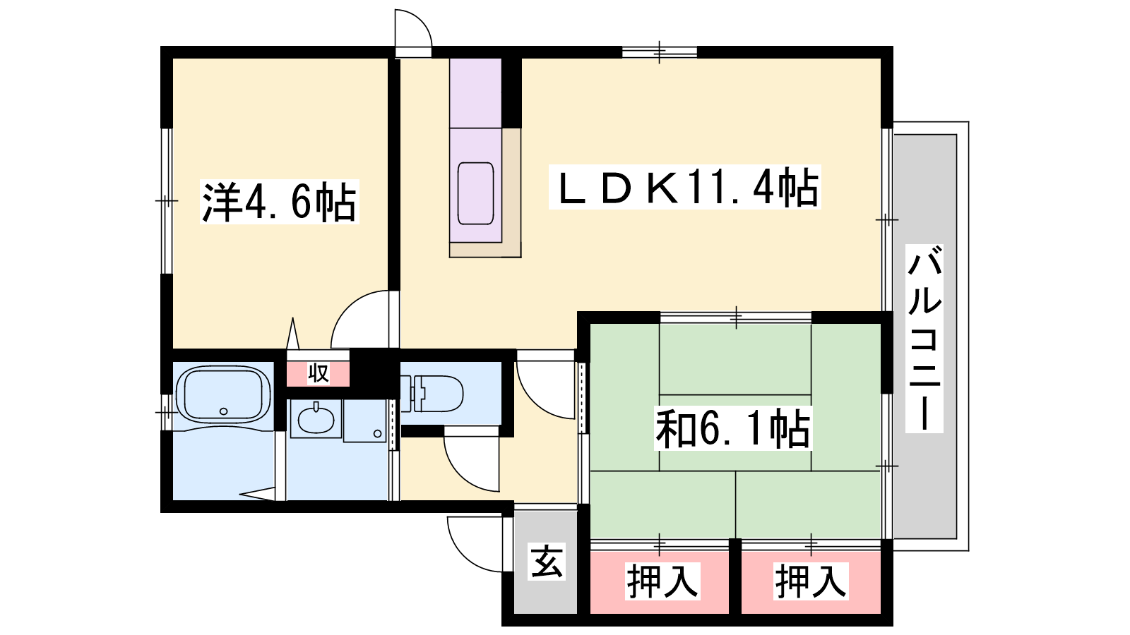 - LDK11.4帖、洋室4.6帖、和室6.1帖
