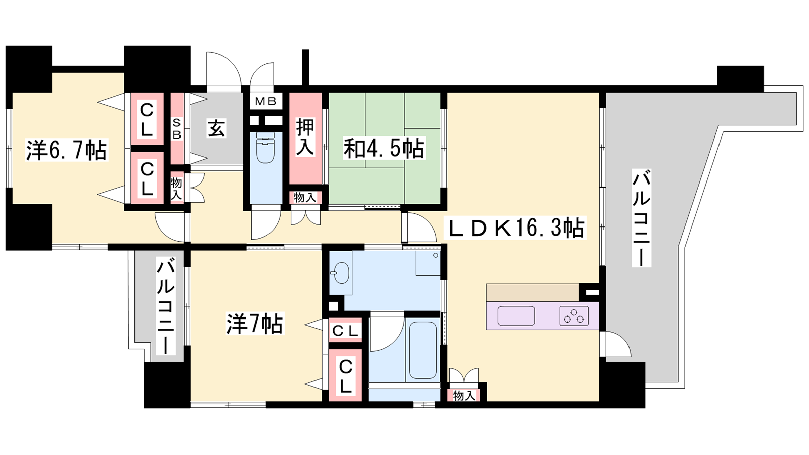 - LDK16.3帖、洋室7帖、洋室6.7帖、和室4.5帖