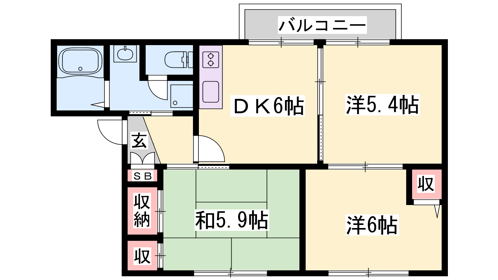 - DK6帖、和室5.9帖、洋室6帖、洋室5.4帖