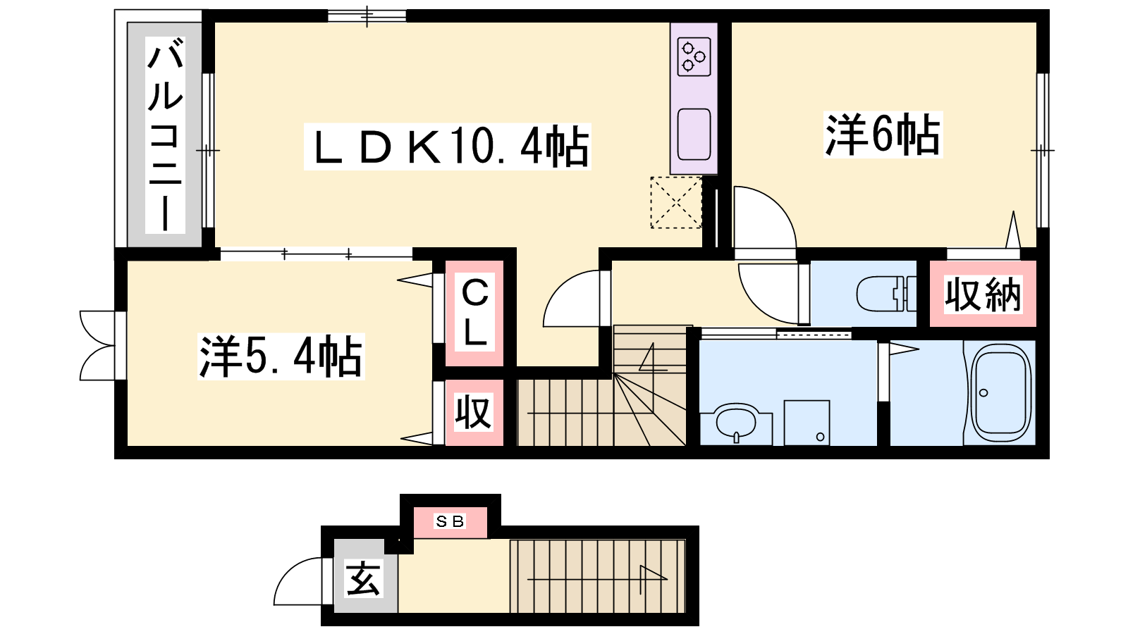 - LDK10.4帖、洋室6帖、洋室5.4帖