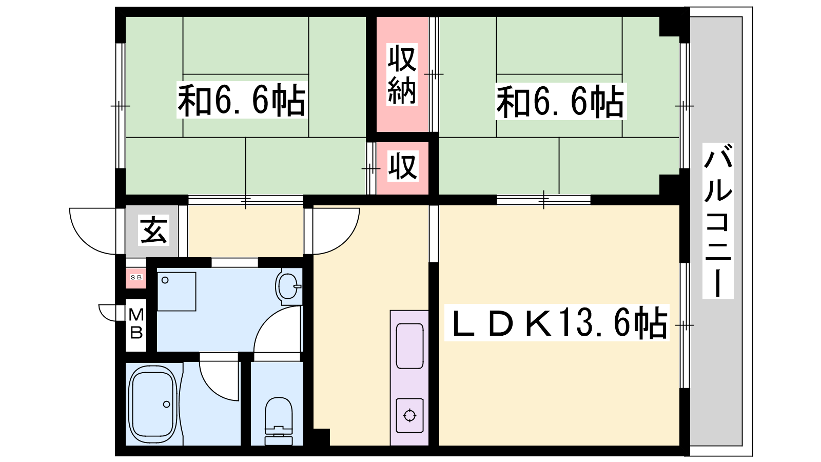 - LDK13.6帖、和室6.6帖、和室6.6帖