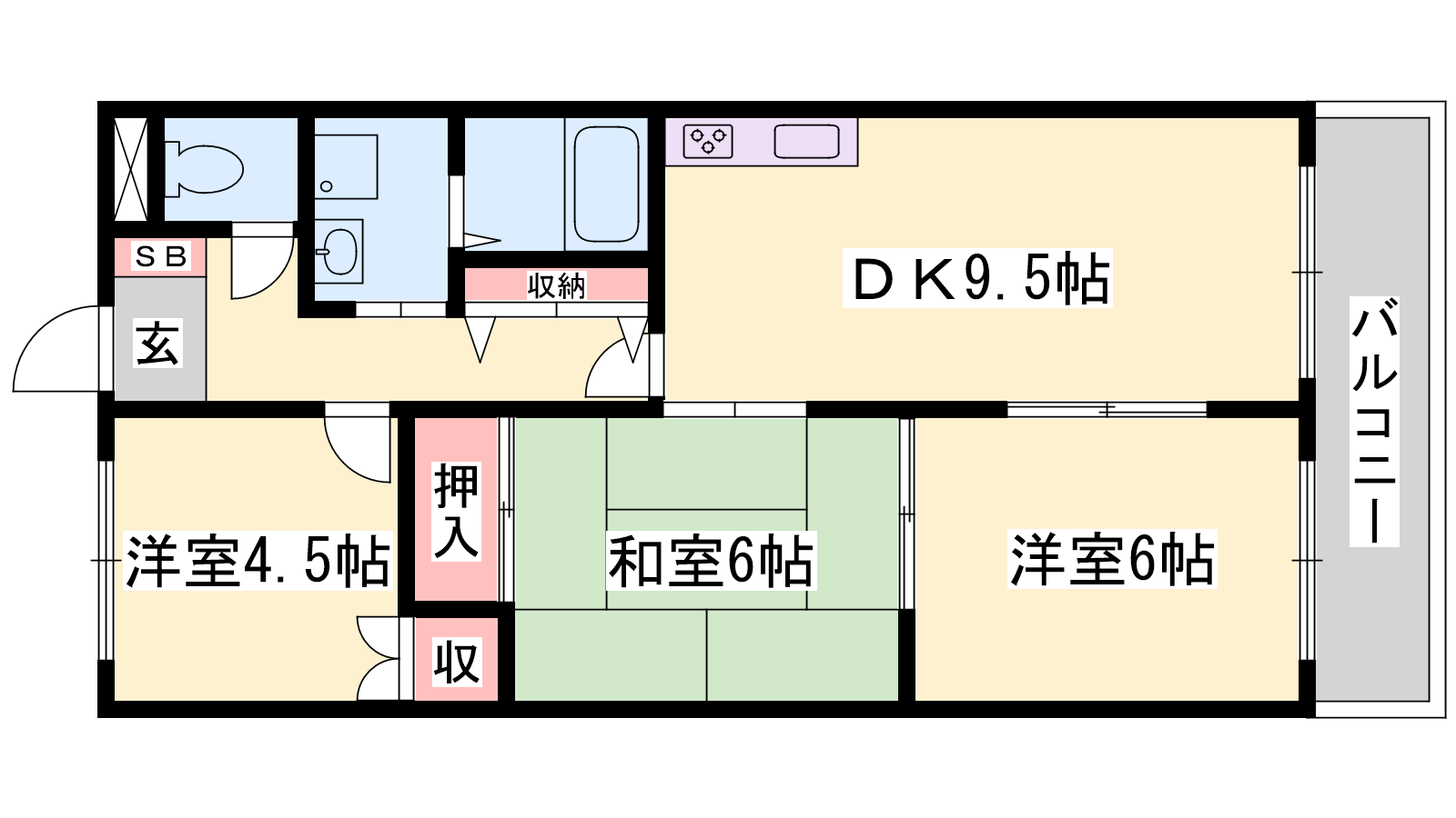 - DK9.5帖、洋室6帖、洋室4.5帖、和室6帖