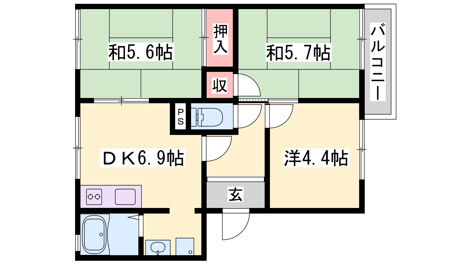 - DK6.9帖、洋室4.4帖、和室5.7帖、洋室5.6帖