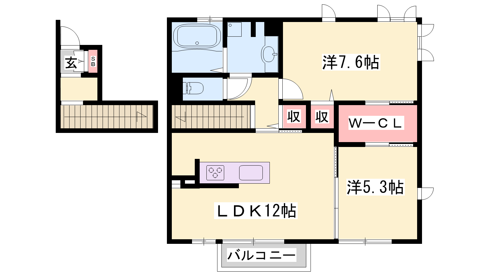 - LDK12帖、洋室7.6帖、和室5.3帖