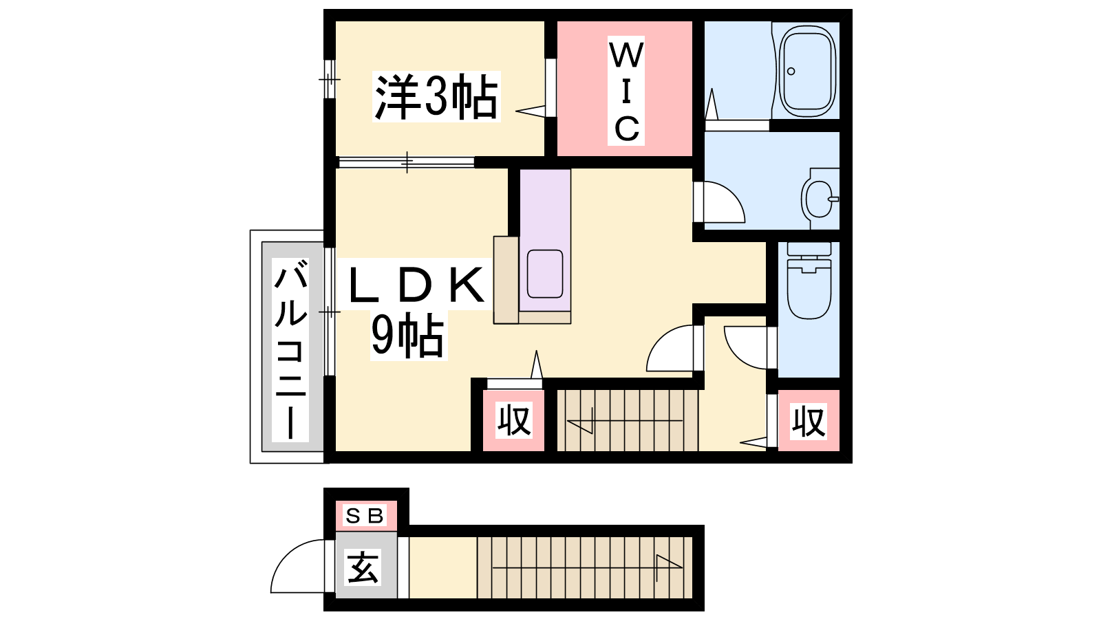 - LDK9帖、洋室3帖