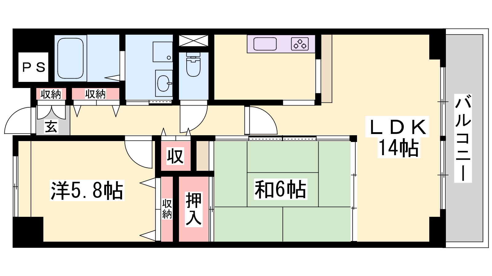 - LDK14.5帖、洋室5.8帖、和室6帖