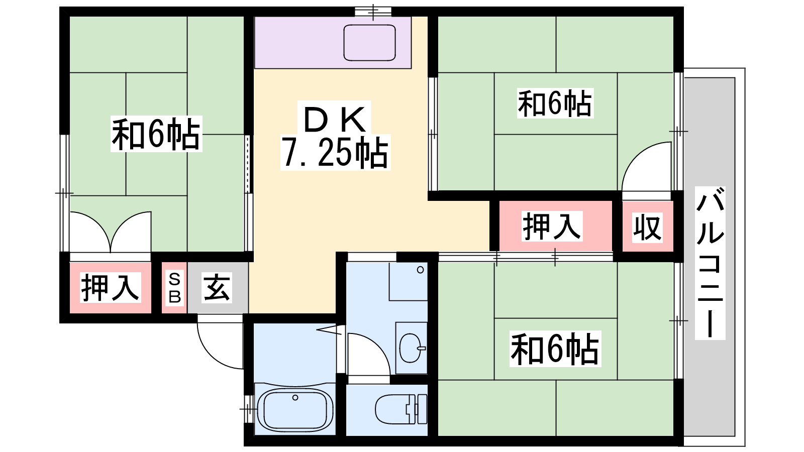 - LDK7.25帖、和室6帖、和室6帖、和室6帖