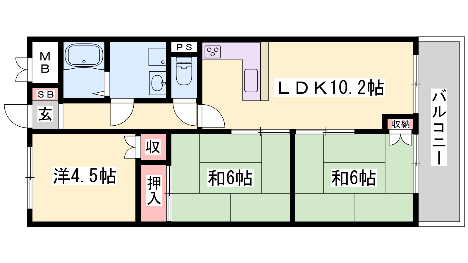 - LDK10.2帖、洋室4.5帖、和室6帖、和室6帖