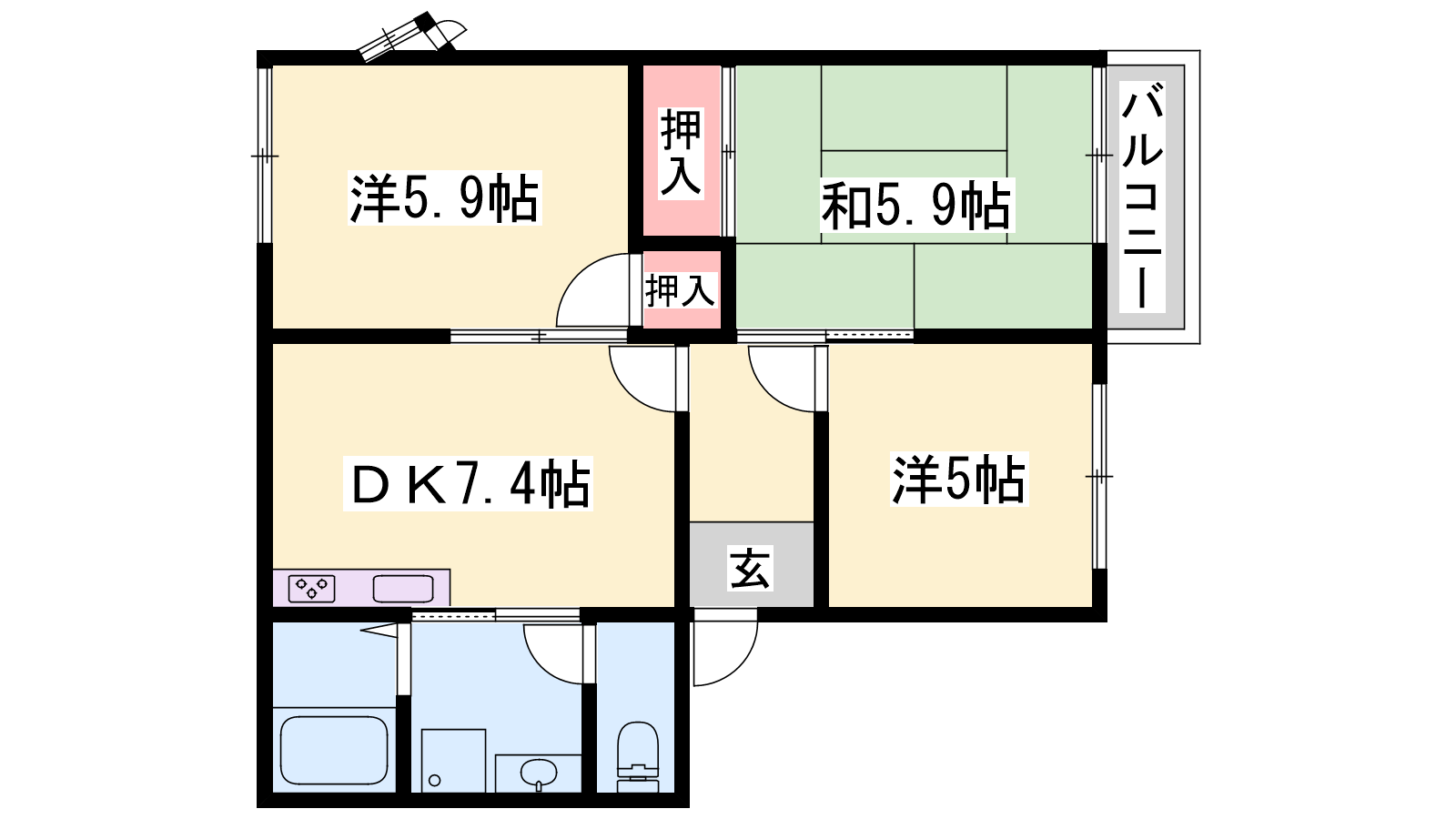 - DK7.4帖、洋室5帖、洋室5.9帖、和室5.9帖