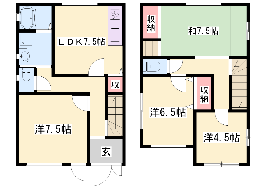 - LDK7.5帖、洋室7.5帖、洋室6.5帖、洋室4.5帖、和室7.5帖