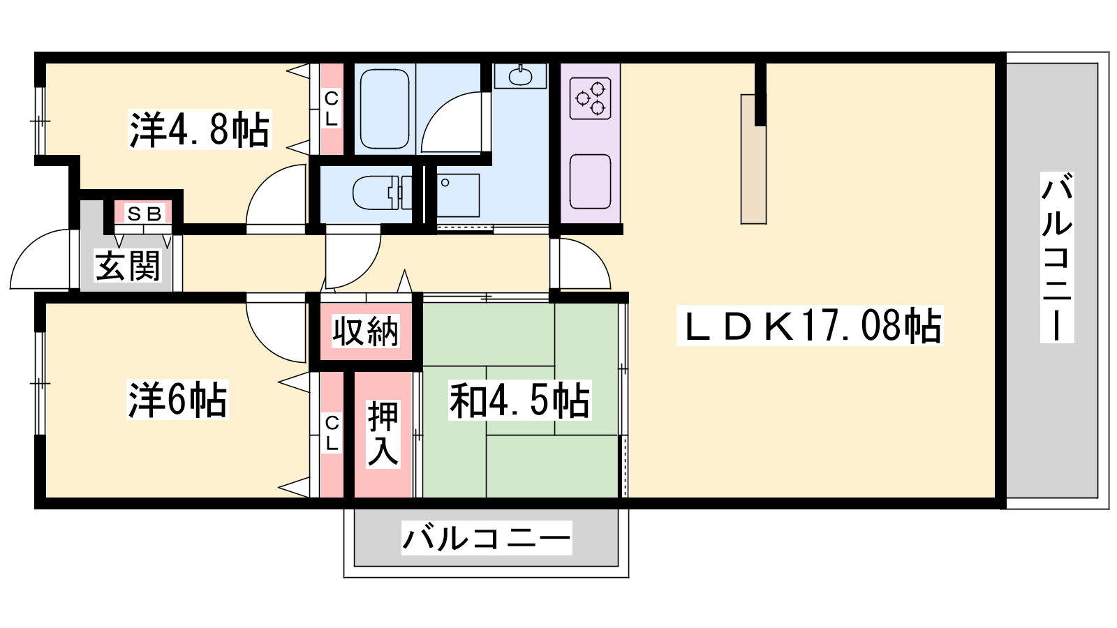 - LDK17.03帖、洋室6帖、洋室4.8帖、和室4.5帖