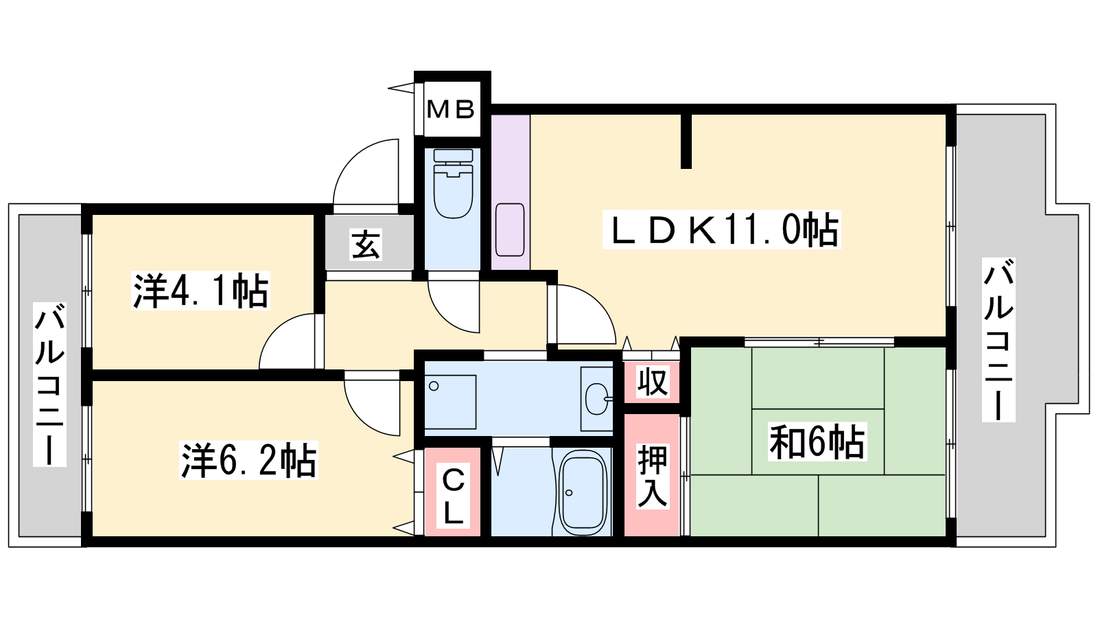 - LDK11帖、洋室6.2帖、洋室4.1帖、和室6帖