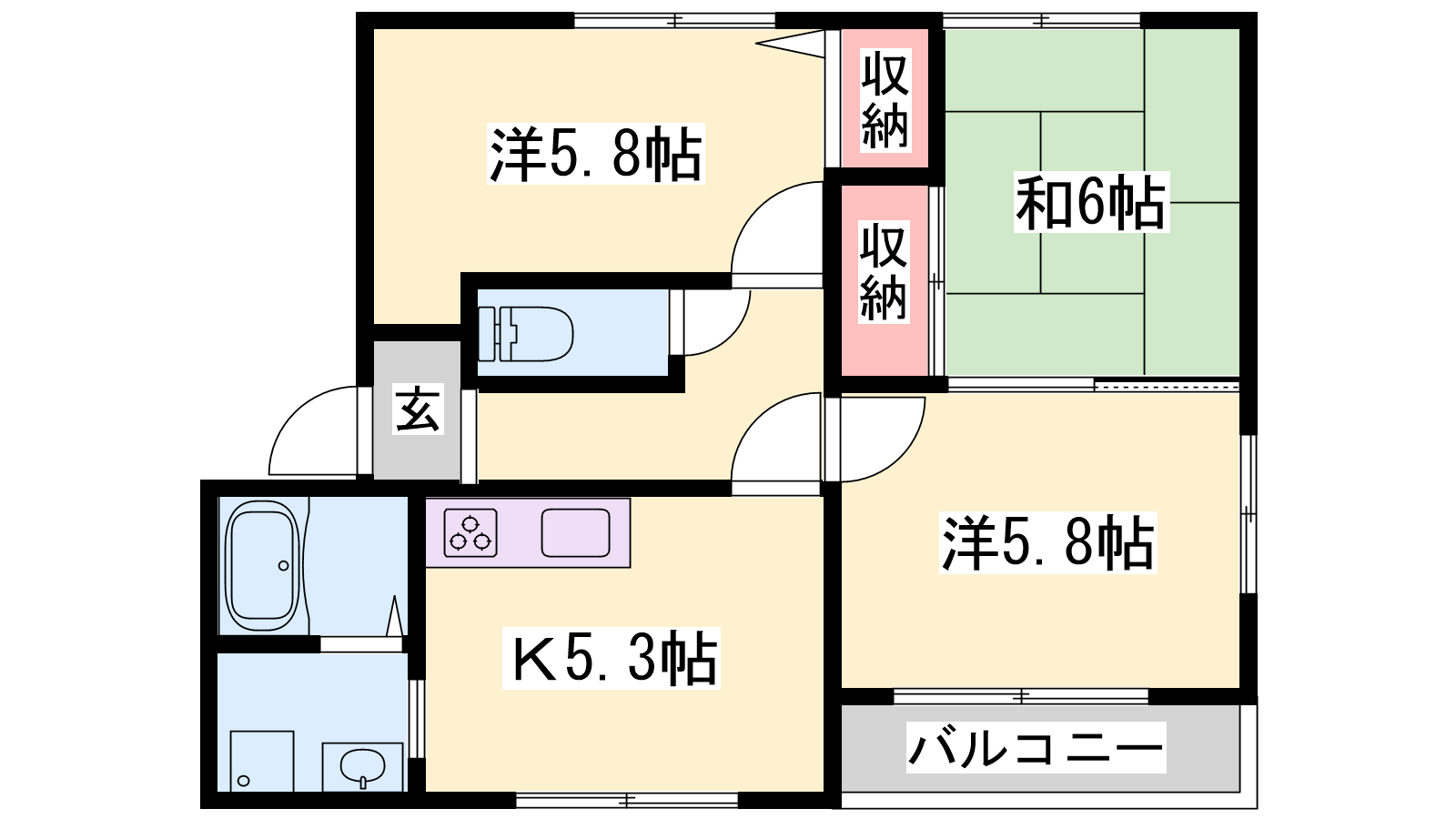 - K5.3帖、洋室5.8帖、洋室5.8帖、和室5.9帖