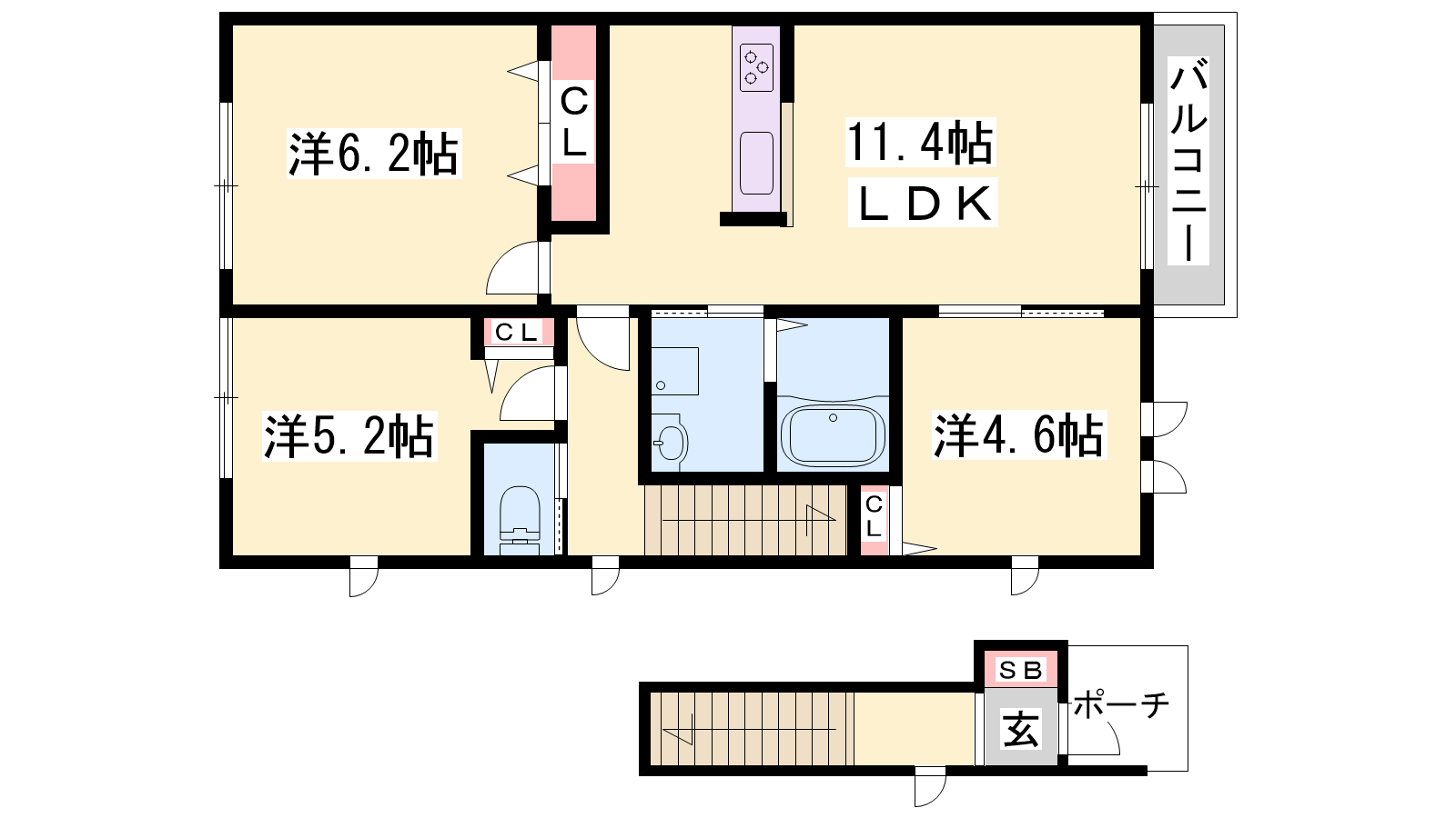 - LDK11.4帖、洋室6.2帖、洋室5.2帖、洋室4.6帖