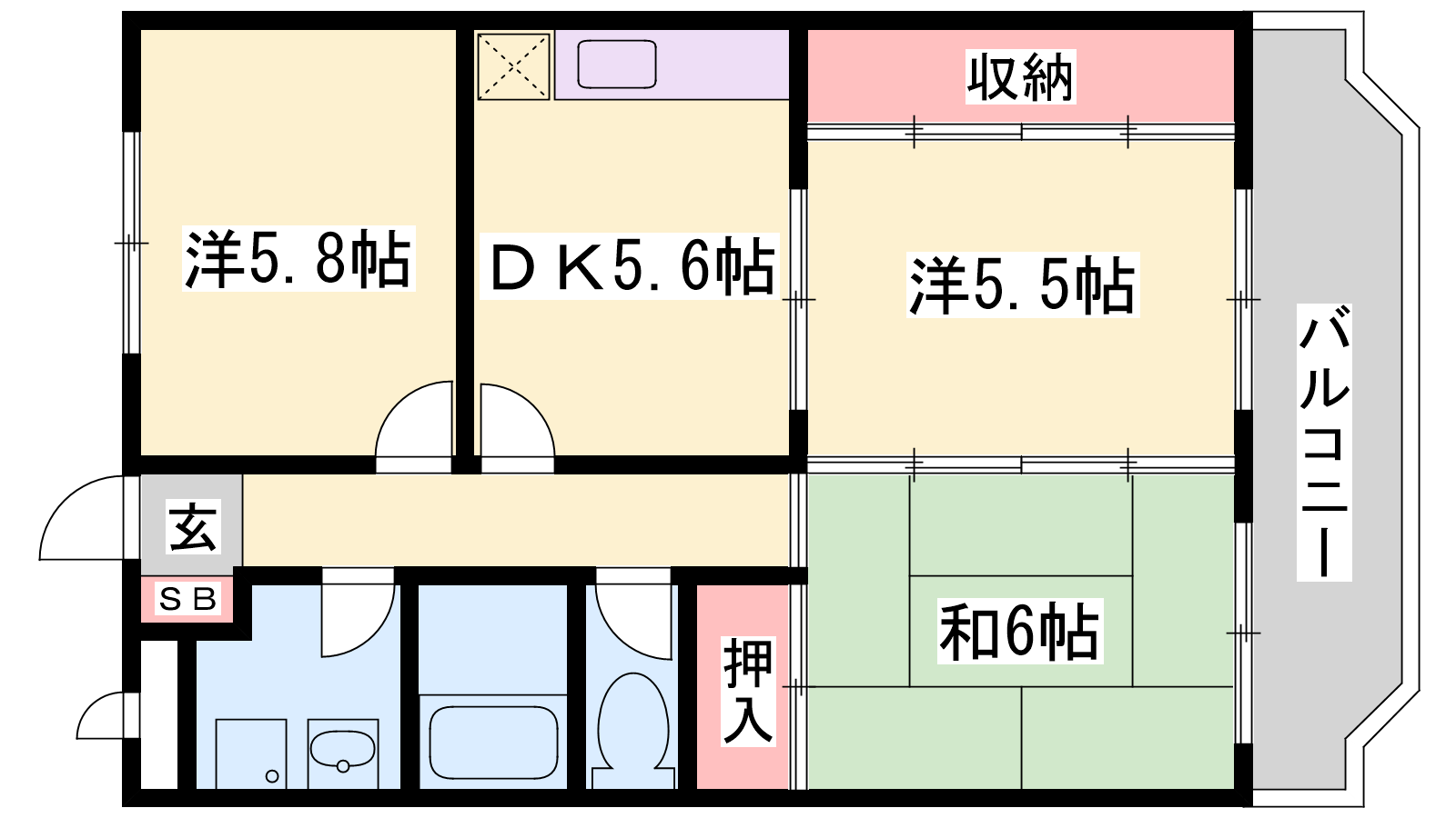 - DK5.6帖、洋室5.8帖、洋室5.5帖、和室6帖