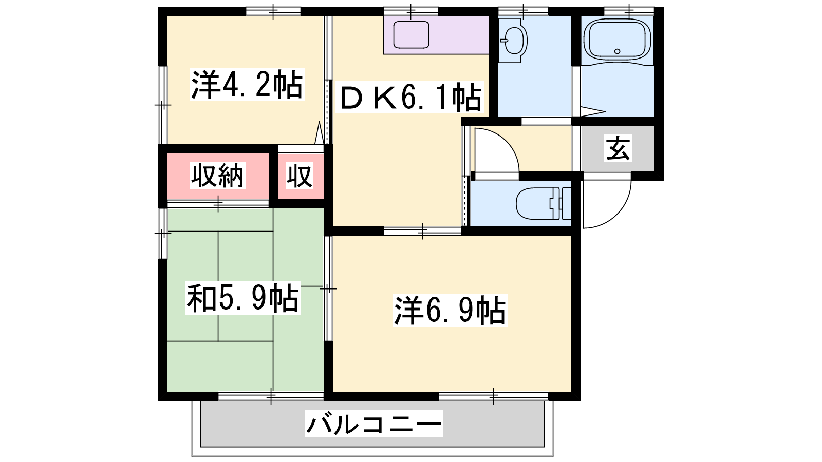 - DK6.1帖、洋室6.9帖、洋室4.2帖、和室5.9帖