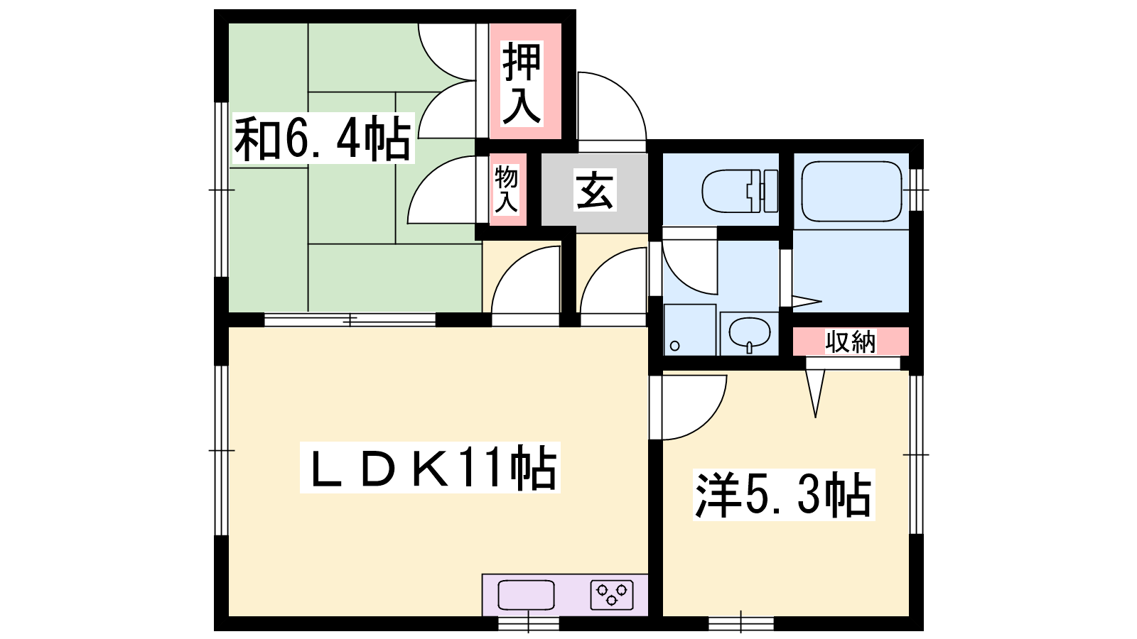 - LDK11帖、洋室5.3帖、和室6.4帖