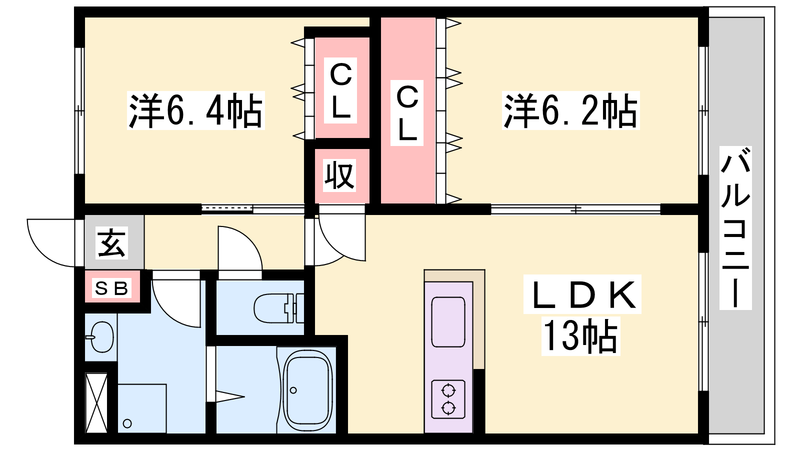 - LDK13帖、洋室6.4帖、洋室6.2帖
