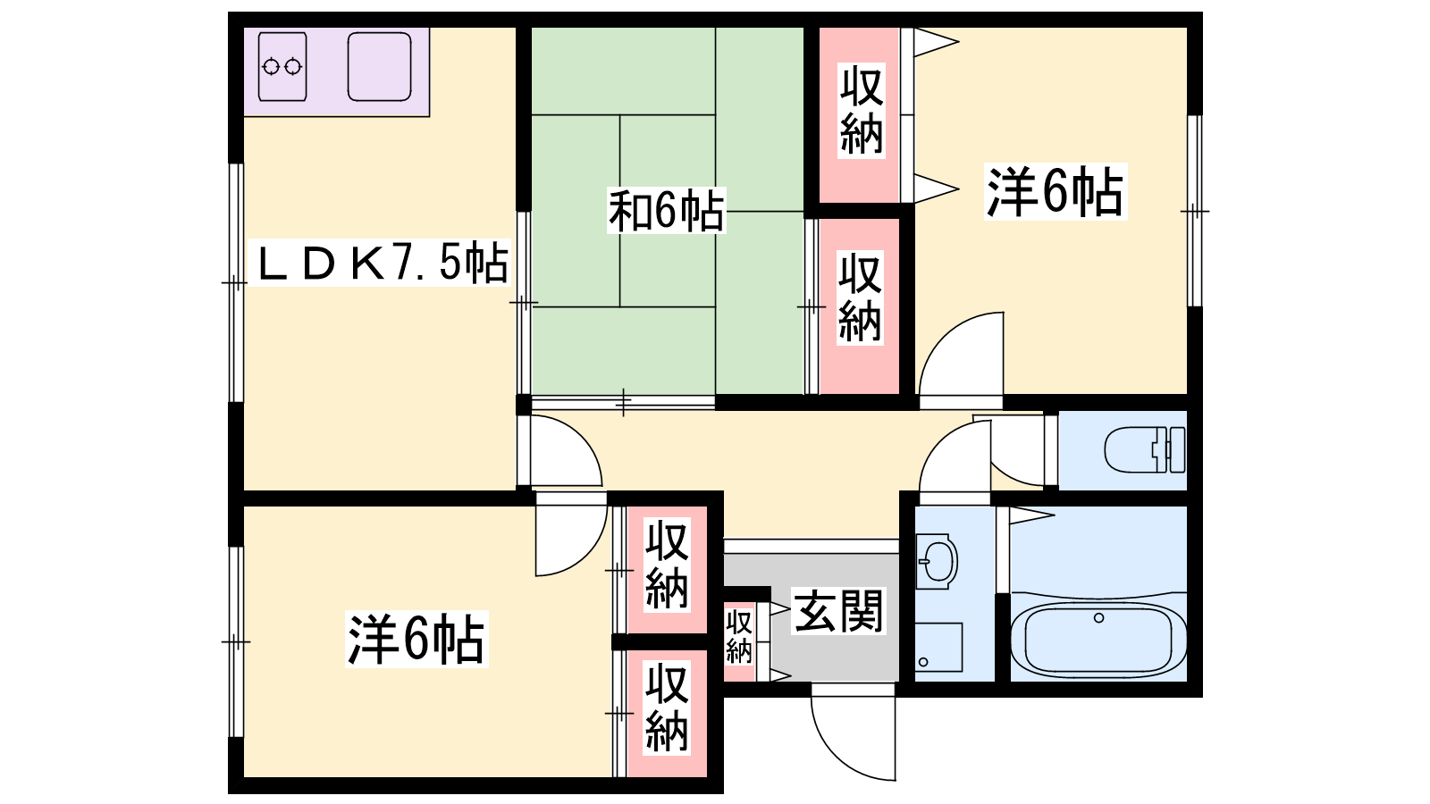 - DK7.5帖、洋室6帖、洋室6帖、和室6帖