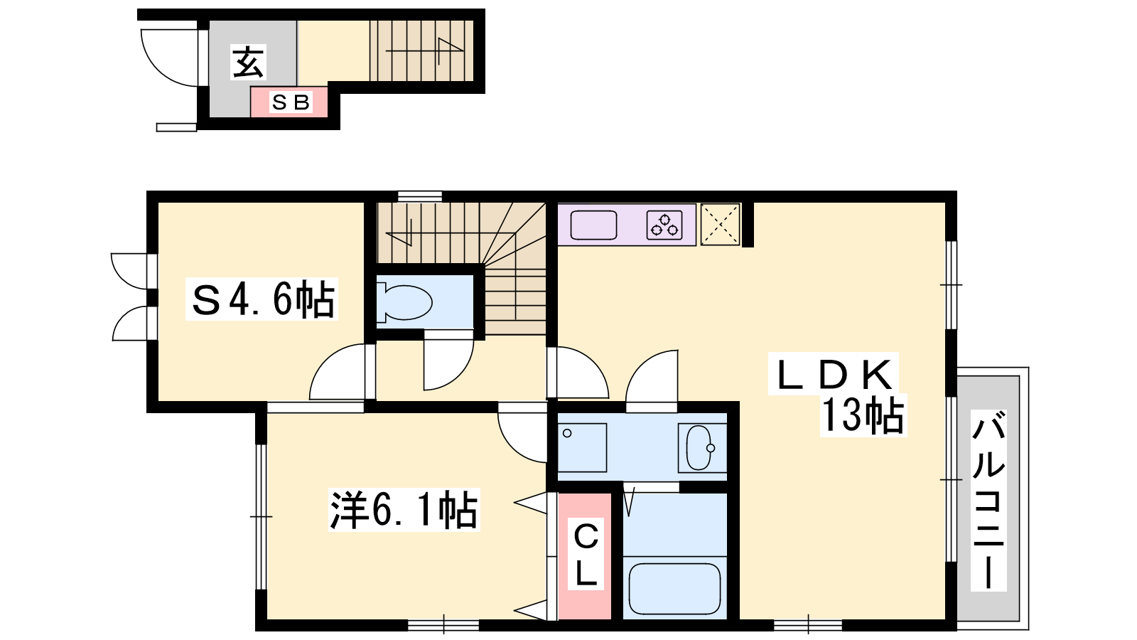 - LDK13帖、洋室6.1帖、S4.6帖