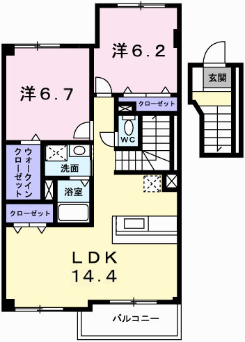- LDK14.4帖、洋室6.7帖、洋室6.2帖