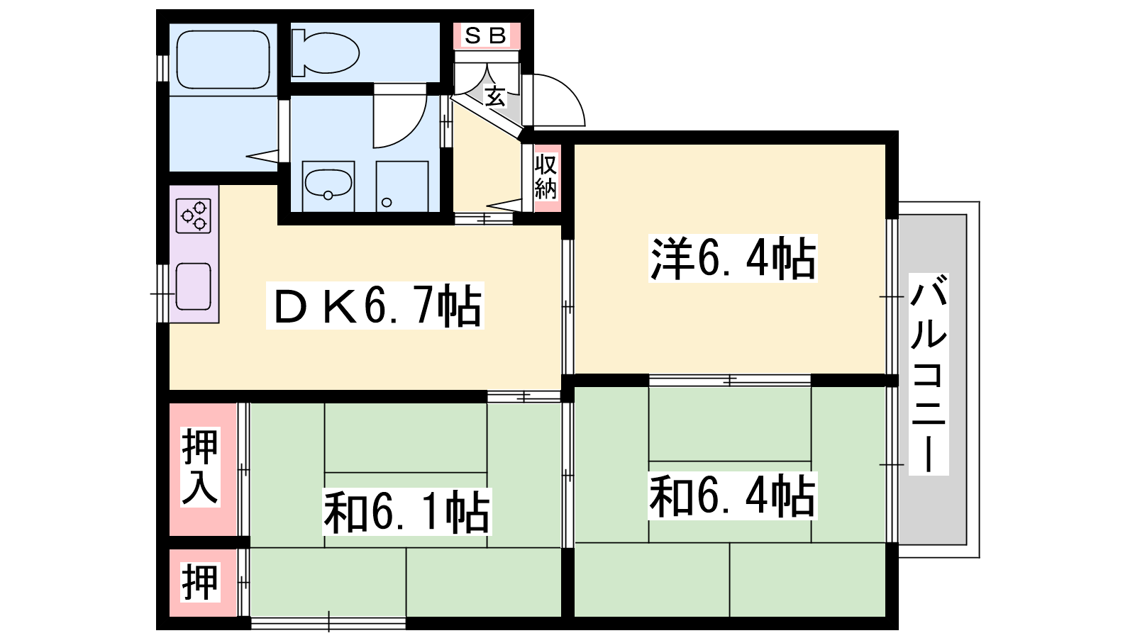 - DK6.7帖、洋室6.4帖、和室6.4帖、和室6.1帖
