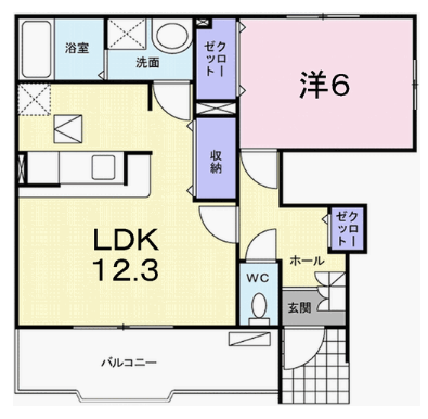 - LDK12.4帖、洋室6.1帖、洋室6.1帖