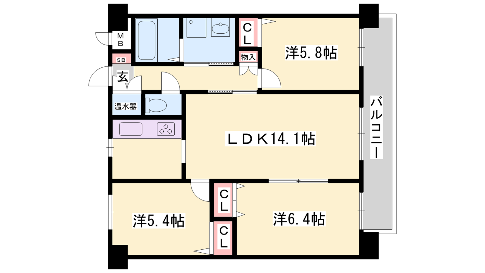 - LDK14.1帖、洋室6.4帖、洋室5.8帖、洋室5.4帖