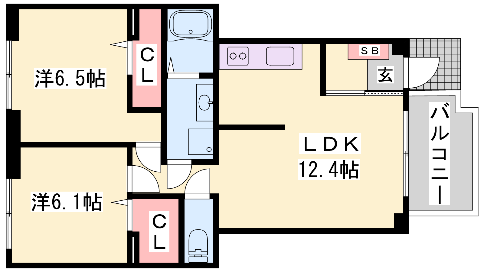 - LDK12.4帖、洋室6.5帖、洋室6.1帖