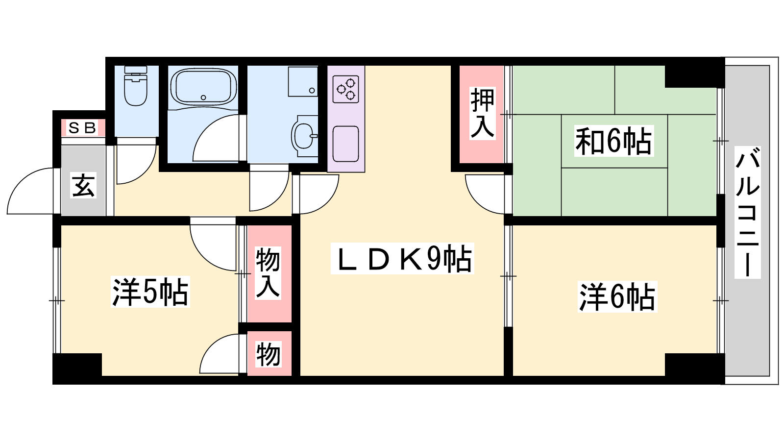 - LDK9帖、洋室6帖、洋室5帖、和室6帖