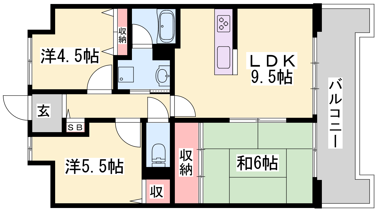 - LDK9.5帖、洋室5.5帖、洋室4.5帖、和室6帖