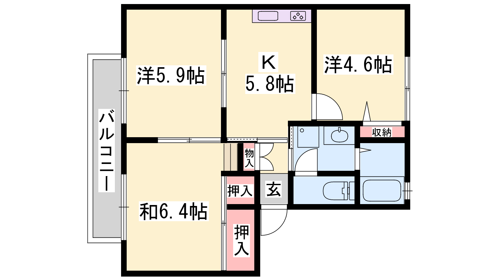 - K5.8帖、和室6.4帖、洋室5.9帖、洋室4.6帖