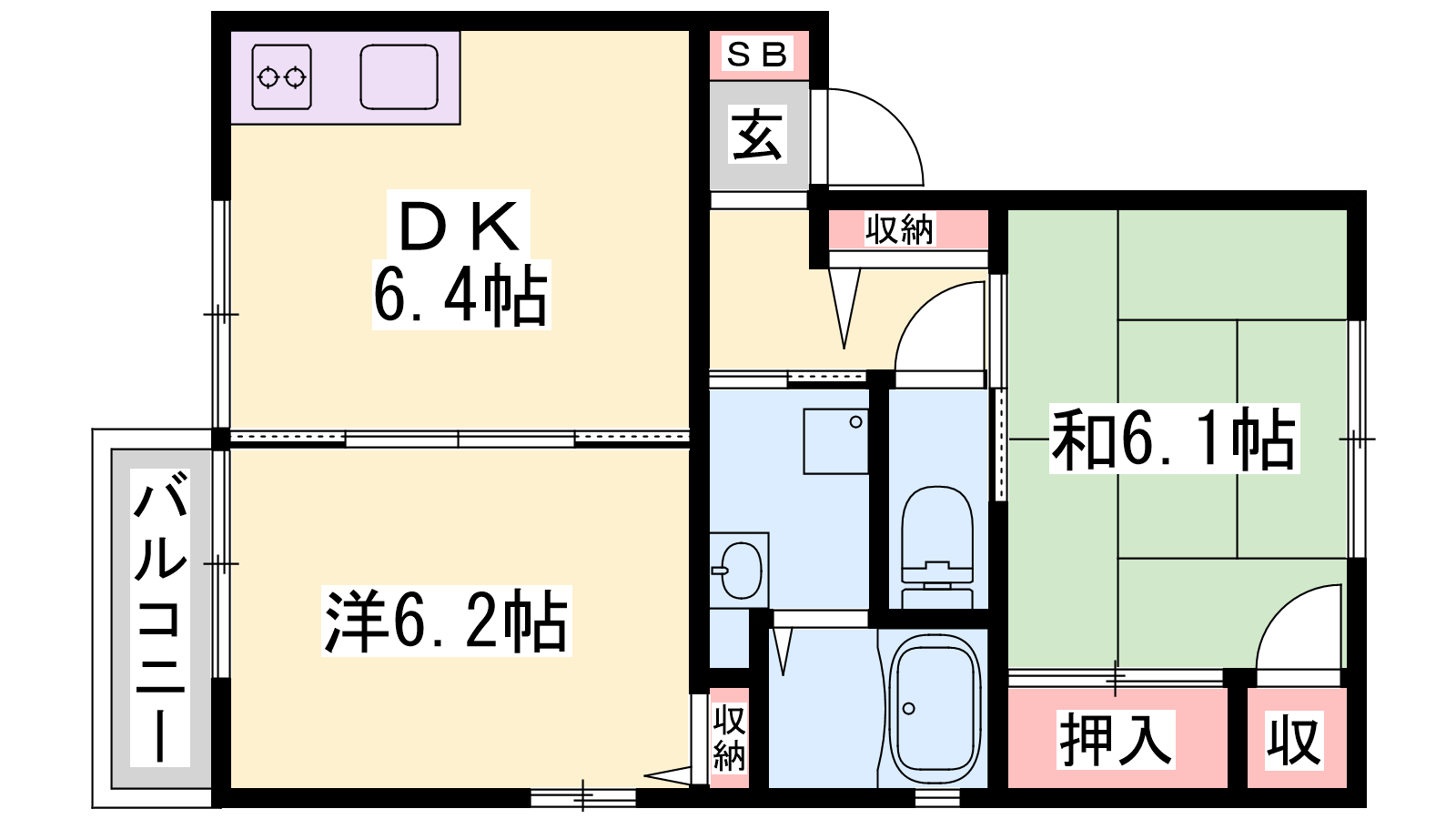 - DK6.4帖、洋室6.2帖、和室6.1帖