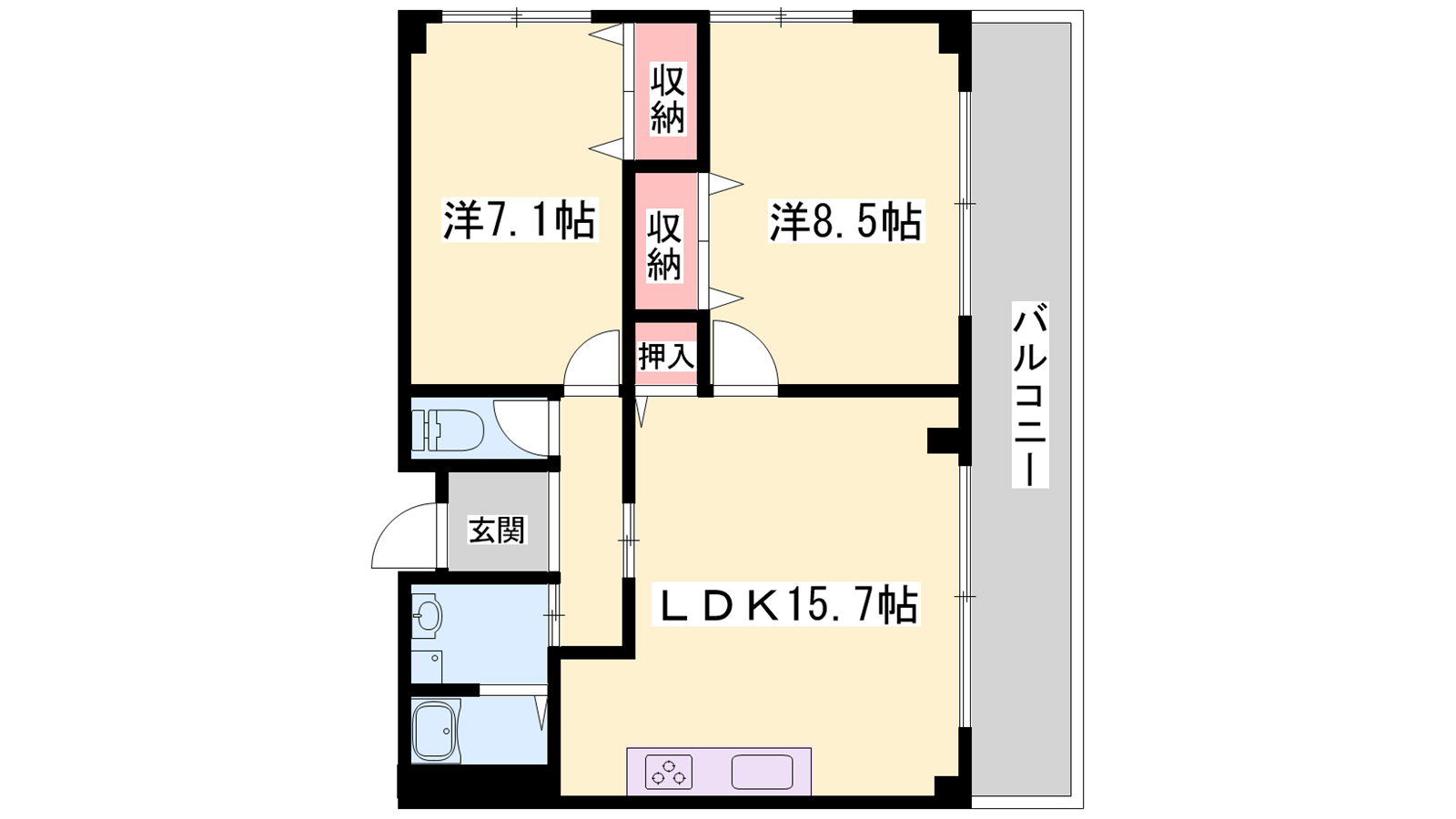 - LDK15.7帖、洋室8.5帖、洋室7.1帖