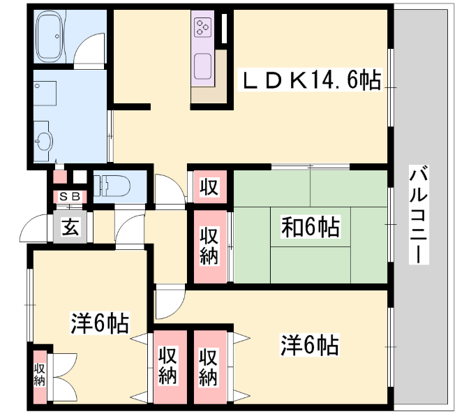 - LDK11.4帖、洋室6帖、洋室6帖、和室6帖