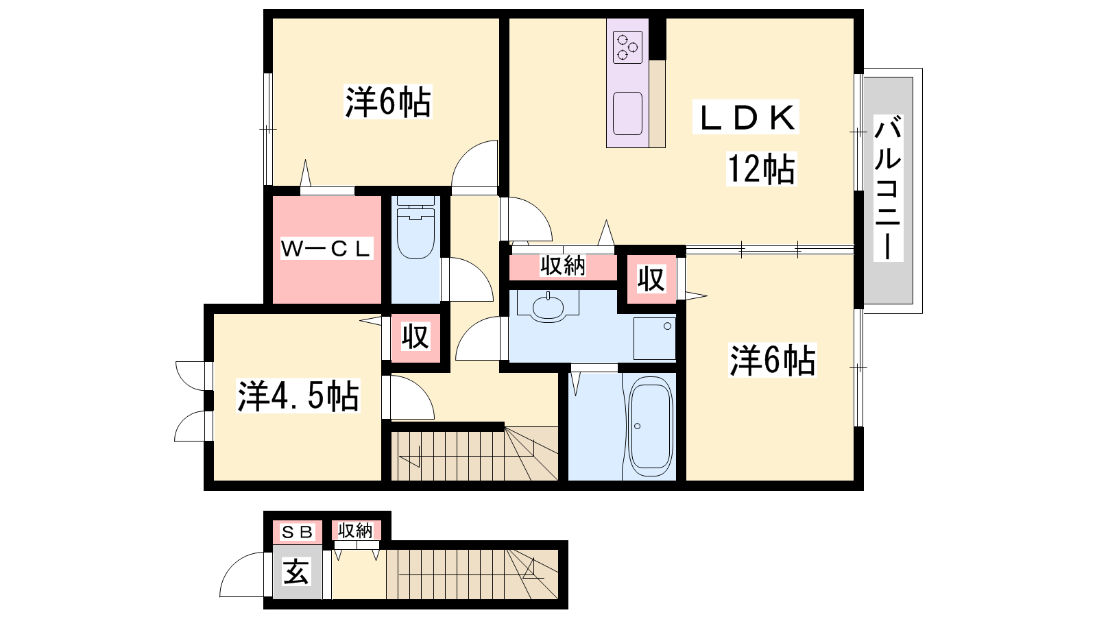 - LDK12帖、洋室6帖、洋室6帖、洋室4.5帖