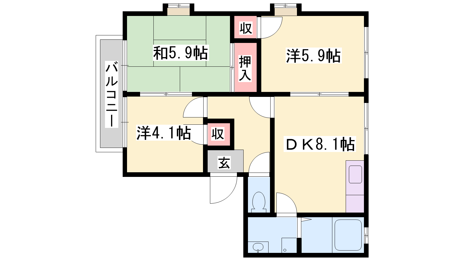 - DK8.1帖、洋室5.9帖、洋室4.1帖、和室5.9帖