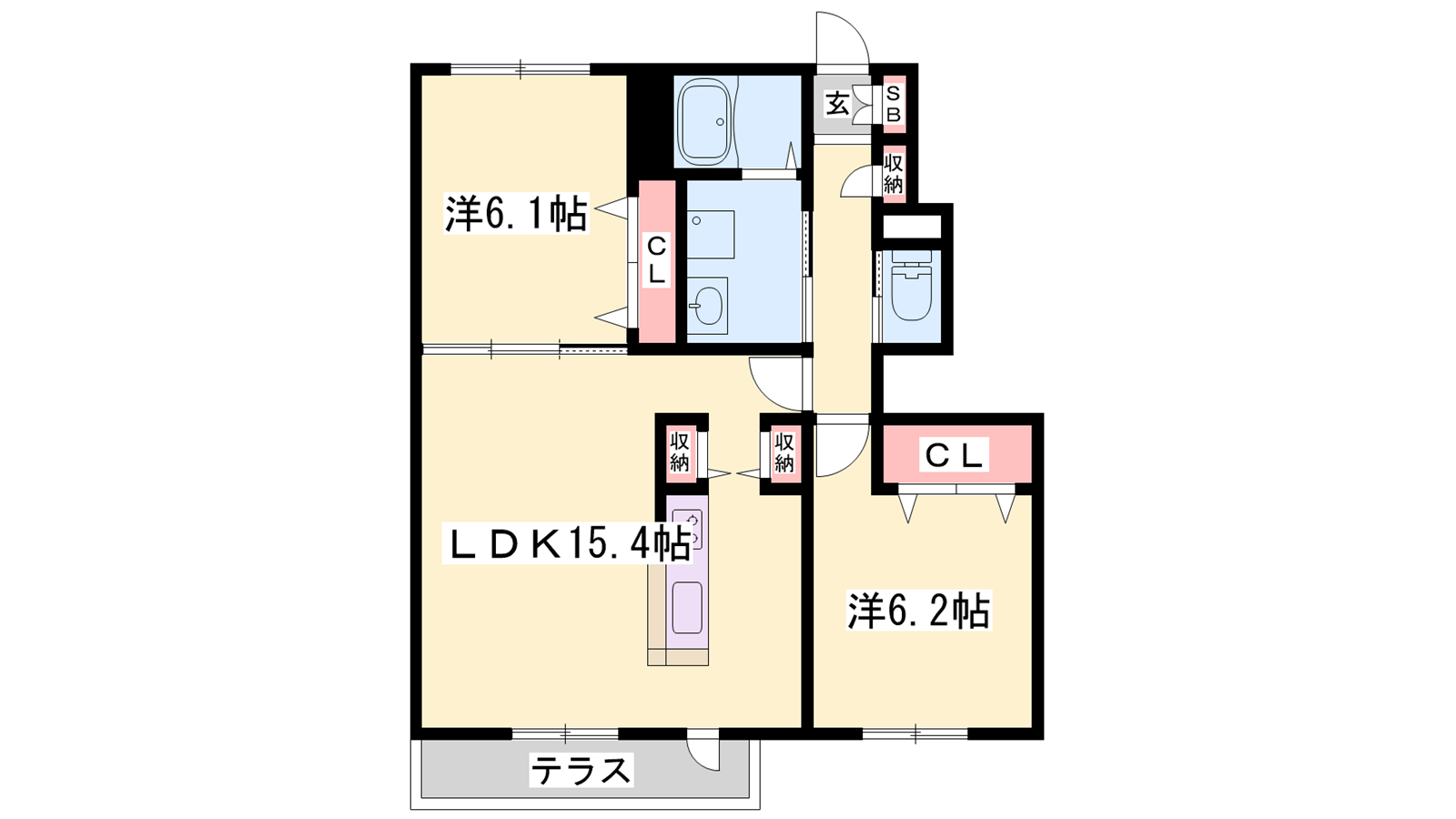 - LDK15.4帖、洋室6.2帖、洋室6.1帖