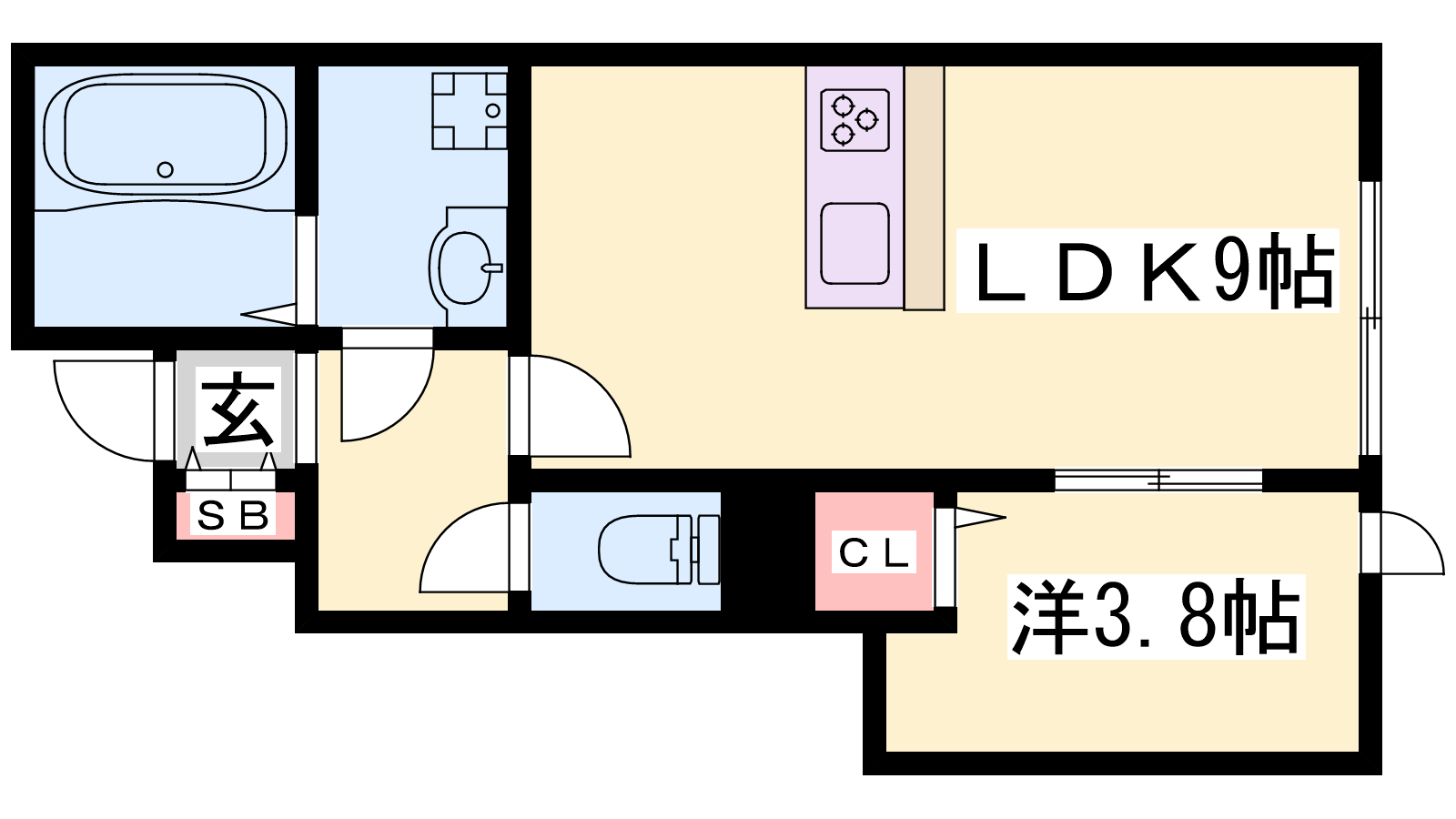 - LDK9帖、洋室3.8帖