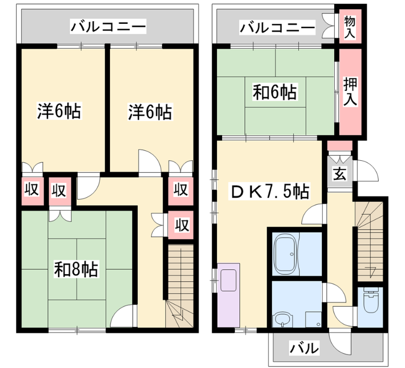 - DK7.5帖、洋室6帖、洋室6帖、和室8帖、和室6帖