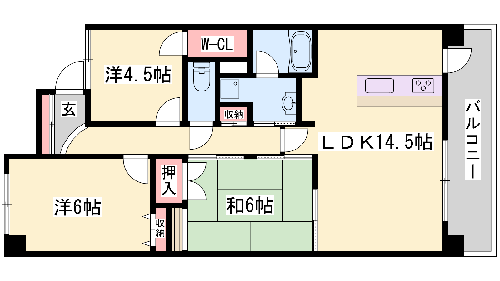 - LDK14.5帖、洋室6帖、洋室4.5帖、和室6帖